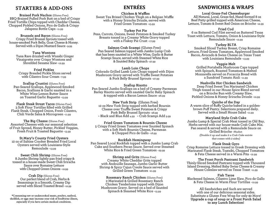 The Front Porch Leonardtown Md Menu
